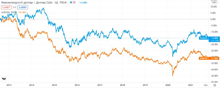 Новозеландский доллар — товарная валюта. Ее курс зависит от экспорта в Китай, Японию и Канаду. У графика актива высокий уровень корреляции с AUD/USD. Неудивительно: обе валюты сырьевые. Экономика стран строится на экспорте, и торгуются они в азиатскую и австралийскую сессии.