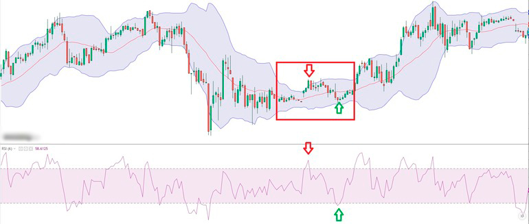 Нужно дождаться периода сужения Bollinger Bands. Когда канал будет визуально уже, чем обычно (на изображении этот узкий отрезок обозначен красным квадратом), нужно переходить к поиску точек входа: