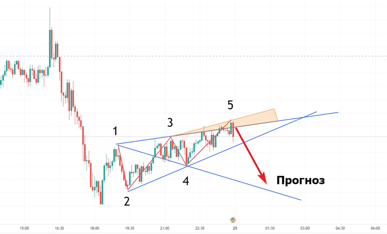 Логика формирования как при бычьем паттерне, но в зеркальной проекции. Первая точка появляется, когда в падающей тенденции происходит небольшой откат. Потом из следующего минимума появляется 2-я точка. После этого впадины и пики растут, а значения между ними уменьшаются. Когда обозначен 5-й экстремум, ожидается падение котировки минимум к границе, пересекающей 1-4 и находящейся в одной вертикали с перекрестием клина, как на следующем рисунке.