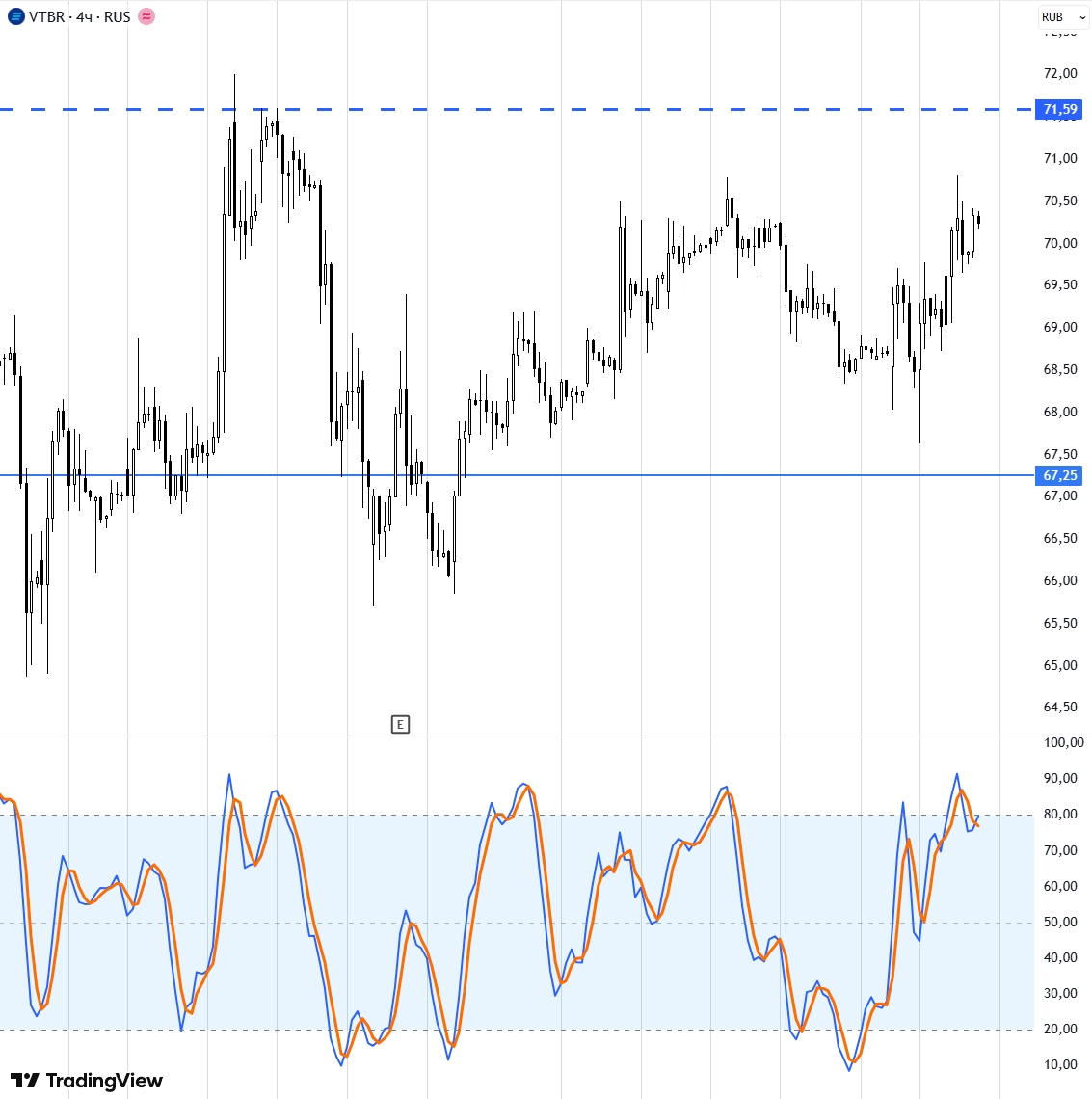 Если говорить о техническом аспекте, то глобально наблюдается консолидация, но при этом покупатели действуют активно. И невзирая на то, что стохастик находится в перепроданности, сохраняется шанс на потенциальный ретест отметки 71,59 рублей.