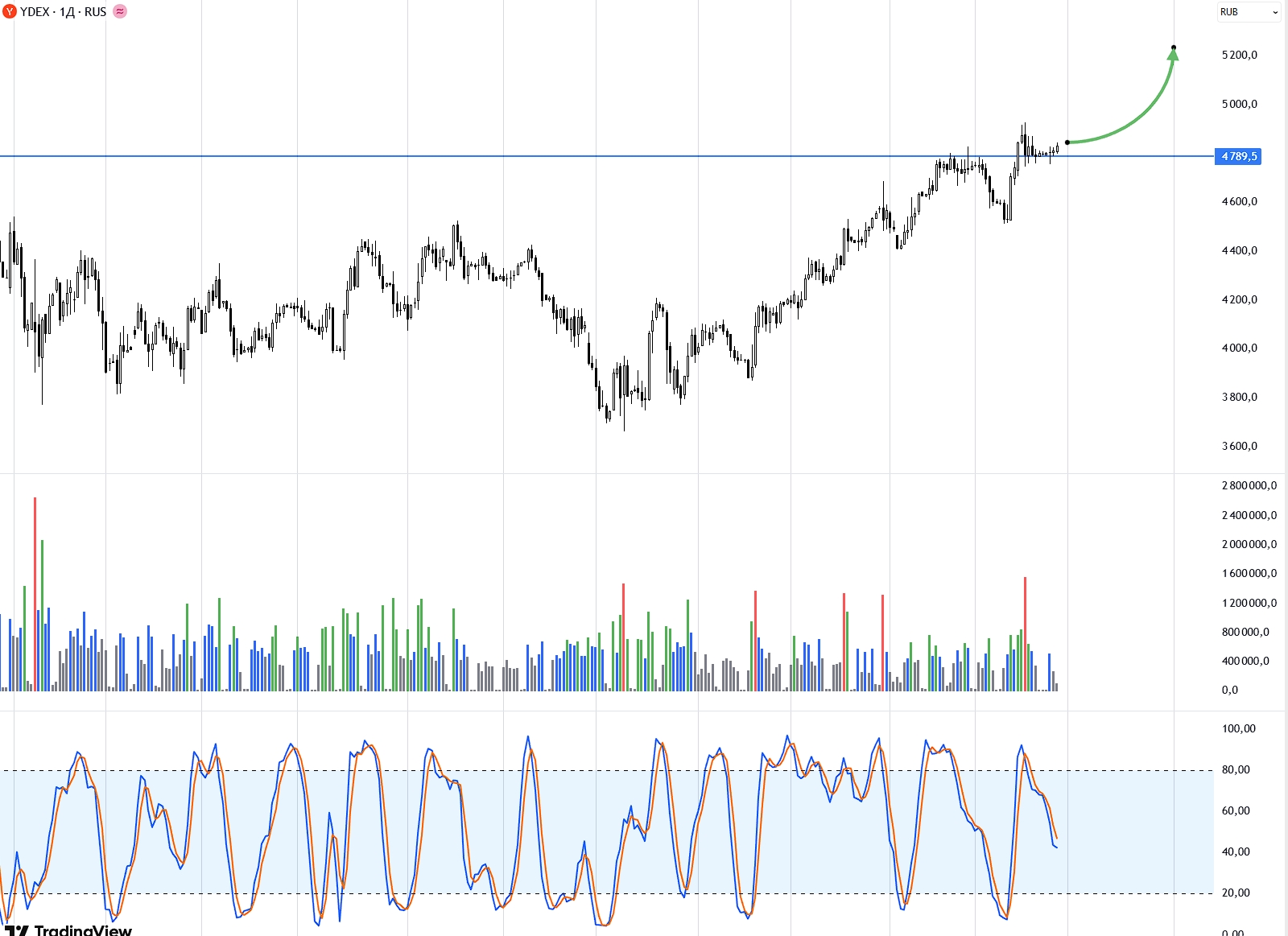 Сейчас имеет смысл присматриваться к покупкам. Есть вероятность, что в скором времени котировки уйдут на ретест 5000 и 5200 рублей.