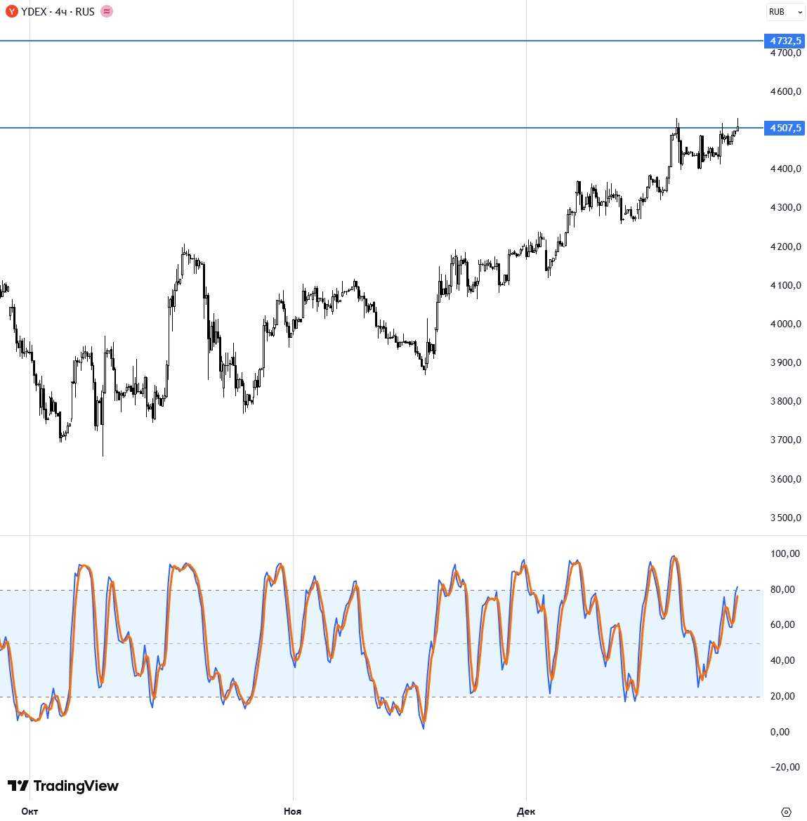 Стоит также учесть, что цена пришла на ретест отметки 4507 рублей. Это довольно сильная область спроса, при этом стохастический осциллятор расположился в зоне перекупленности. Это создает предпосылки для формирования отката. Но пока нет оснований говорить о том, что потенциально это выльется в развитие медвежьего тренда.